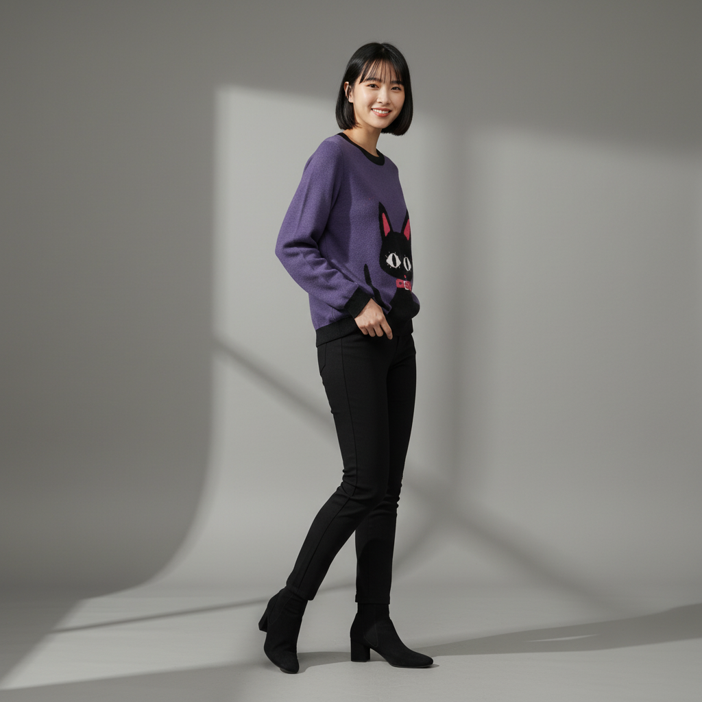 Envuélvete en un encanto acogedor con el Suéter de punto Nana Cat , una elegante pieza inspirada en la querida serie Abuela .